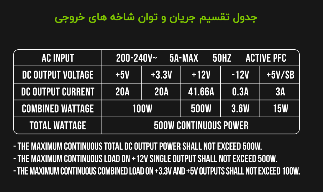- ریپل و نویز ولتاژ کمتر از 30mv p-p در تمامی شاخه های اصلی خروجی (12V, +5V ,+3.3V+)